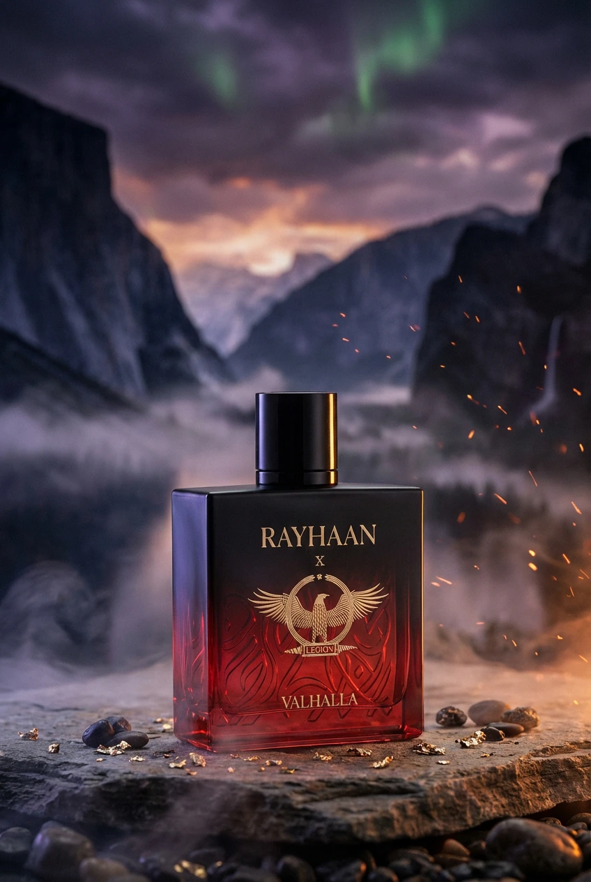 Valhalla by Rayhaan is a Aromatic Fruity fragrance for men. This is a new fragrance. Valhalla was launched in 2025. Top notes are Cognac, Raspberry and Liquor; middle notes are Bulgarian Rose, Tonka Bean and Oakmoss; base notes are Oak, Sandalwood and Praline.